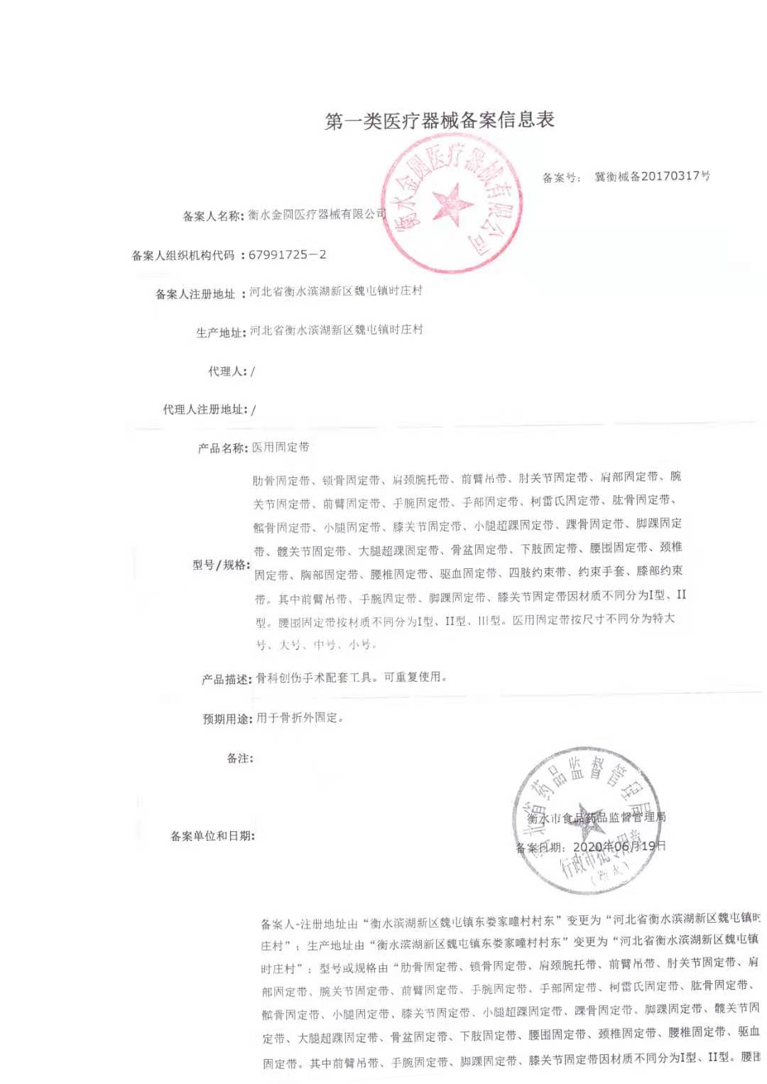衡水金圓醫療器械有限公司,座落于風景秀麗的自然保護區衡水湖畔,北鄰京九鐵路、石徳鐵路,西臨106國道,地理位置優越,交利。公司研發各類護理器具、醫療保健用品,目前在衡水市醫療器械品種齊全,規模較大的廠家。 主要產品有:自發熱運動護具、醫用固定帶、腹帶、各種醫用拐、多功能護理床、產床、高分子支具、骨折固定夾板、夾板、彈力網狀繃帶帽等。